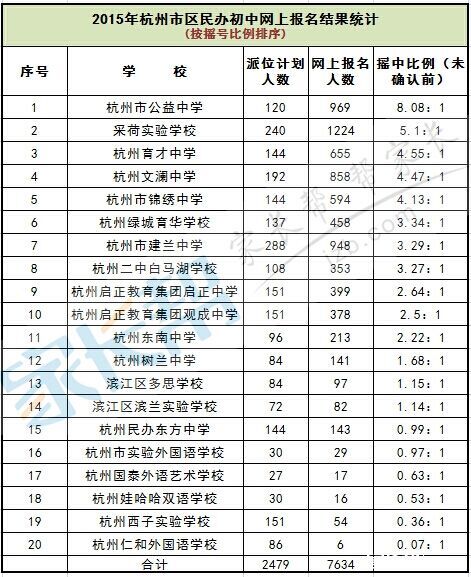 2015年杭州市區(qū)民辦初中網(wǎng)上報名結果統(tǒng)計