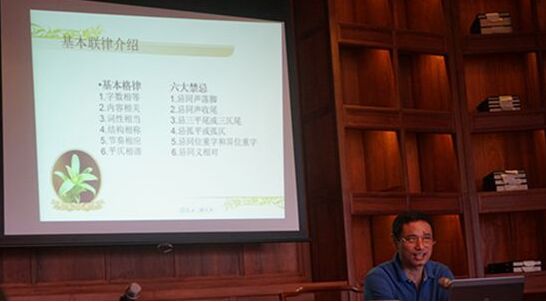他首先從理論入手,結合理論講解進行了正格、非正格經(jīng)典聯(lián)例剖析,再以他的《飲和集》收集的楹聯(lián)為例,組織學員進行現(xiàn)場消化。學員們普遍感到深入淺出,通俗易懂。