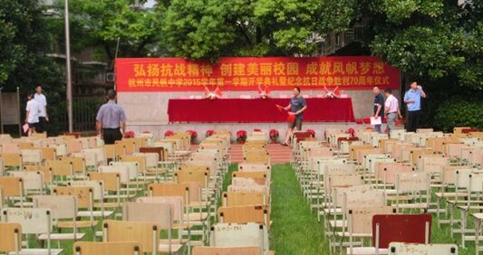 《杭州超限教育中心王林2015年9月7日訊》近日,杭州市風(fēng)帆中學(xué)的操場(chǎng)上整齊得排列著一排排椅子,等待著新學(xué)期歸來(lái)的同學(xué)們。校園的籃球場(chǎng)上掛起了紀(jì)念中國(guó)人民抗日戰(zhàn)爭(zhēng)暨世界反法西斯戰(zhàn)爭(zhēng)勝利70周年的宣傳橫幅,全體同學(xué)們以班級(jí)為方陣,手拿小紅旗,等待著開(kāi)學(xué)典禮的進(jìn)場(chǎng)儀式。