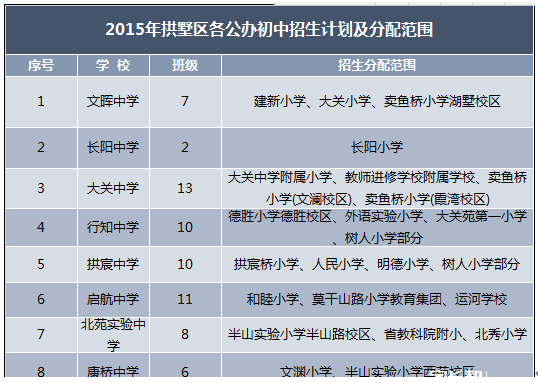 2015年杭州拱墅區(qū)公辦初中招生計(jì)劃及分配范圍