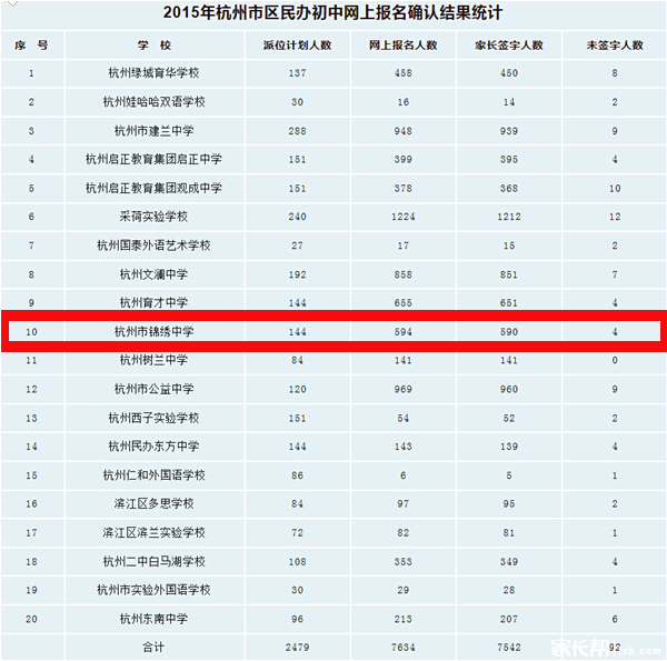 2015年杭州市區(qū)民辦初中網(wǎng)上報(bào)名確認(rèn)結(jié)果統(tǒng)計(jì)