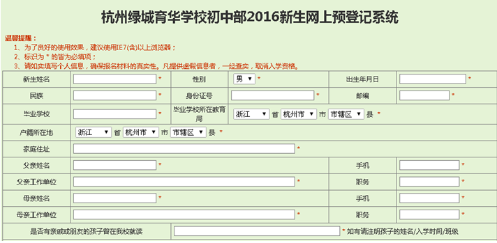 《杭州超限教育中心李林2016年04月20日訊》 綠城育華2016年新生網(wǎng)上預(yù)登記系統(tǒng)開始填寫啦!初步估計(jì),應(yīng)該有一部分家長(zhǎng)已經(jīng)填寫過了。為了方便還不知道的家長(zhǎng)們,下圖是綠城育華2016年的報(bào)名預(yù)登記系統(tǒng)表,家長(zhǎng)可參考,另附綠城育華報(bào)名預(yù)登記系統(tǒng)網(wǎng)上報(bào)名網(wǎng)址: