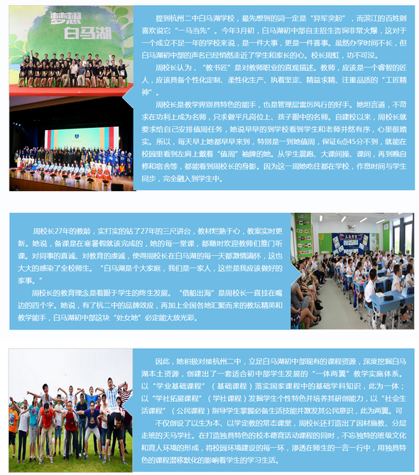 《杭州超限教育中心李林2016年05月03日訊》杭二白馬湖初中部近幾年來,在民辦教育行列積極向前發(fā)展,取得了良好的成就。近日微訪周虹這樣發(fā)展教育: