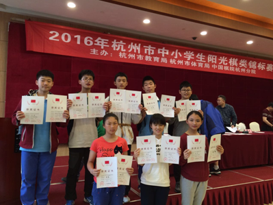 相較于往年,今年初中棋類比賽參賽選手驟增,賽場上高手如云,各學(xué)校的各位棋手都表現(xiàn)出了優(yōu)秀的旗手風(fēng)格,體現(xiàn)了杭州各學(xué)校棋手的優(yōu)秀素質(zhì)。但諸多優(yōu)秀的棋手對我校棋手來說既是壓力也是挑戰(zhàn),最終經(jīng)過兩日,共七輪的比拼,我校各位棋手頂住了壓力,中國象棋有四位同學(xué)進入前八,圍棋有一位同學(xué)進入前八,同時,中國象棋和圍棋都獲得了團體第一的好成績。