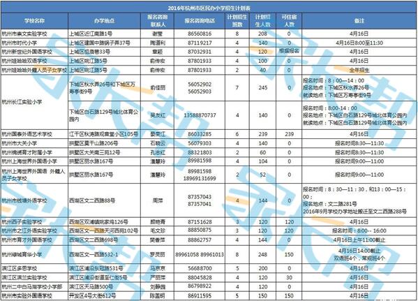2016年杭州市區(qū)民辦小學(xué)招生計(jì)劃表