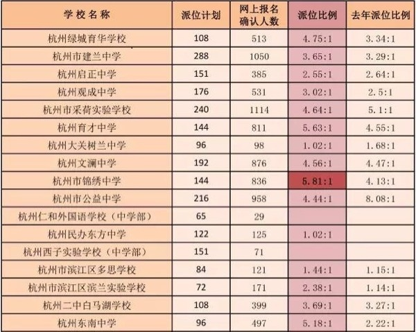 2016年杭州小升初派位報名確認(rèn)人數(shù)為8835人,派位計劃人數(shù)2537人,下圖的2016各個杭州民辦初中的派位比例: