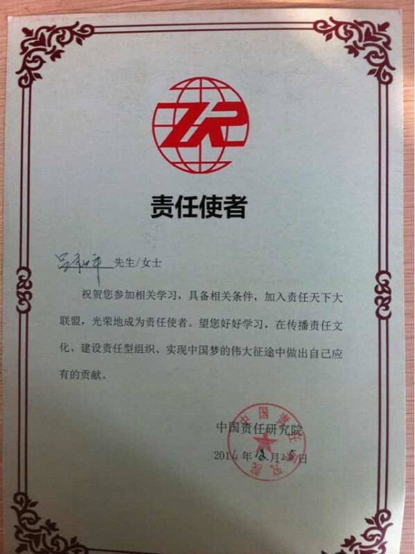 上圖:呂和平先生獲得的“責(zé)任使者”證書(shū)