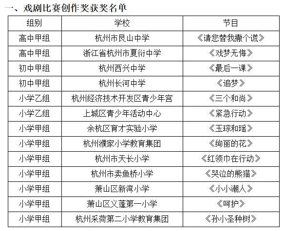 附件:2019年杭州市中小學(xué)生戲劇、舞蹈比賽優(yōu)秀創(chuàng)作獎獲獎名單